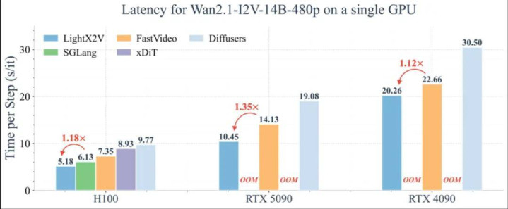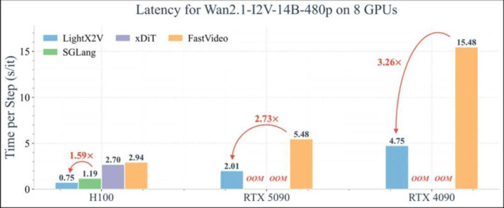 在同类开源方案中,LightX2V 相比 SGLang Diffusion, FastVideo 等优秀的开源框架在延迟和吞吐上都具有明显优势 (如下图单步耗时对比所示),尤其是在 8GB–24GB 消费级显卡区间,更容易跑满硬件能力。