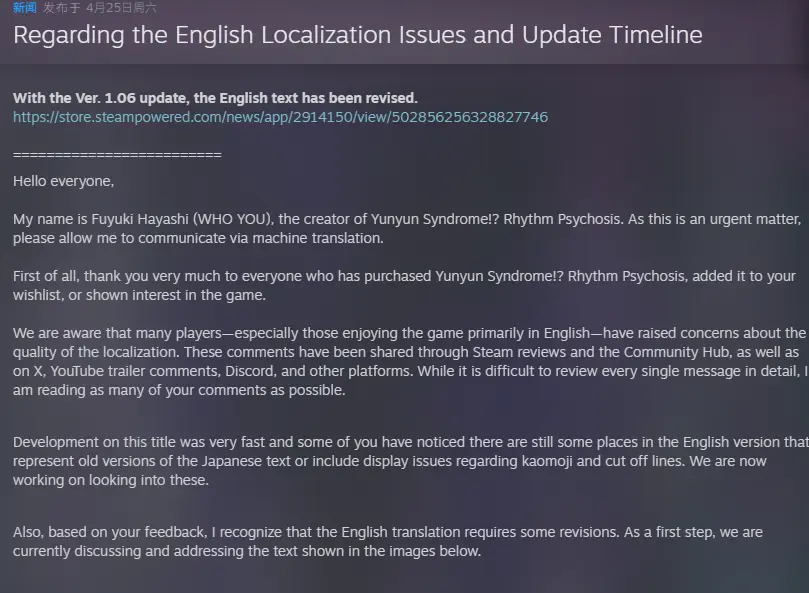 声明发布数小时后,开发者推送了一个大型更新,对超过60处翻译进行了调整。